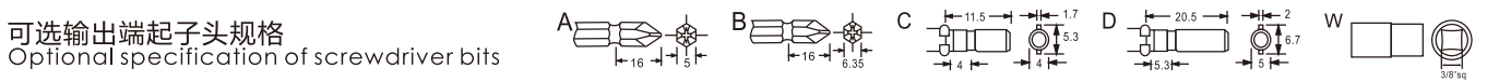 | 型号 | 扭力范围 | 空载转速 | 输入电压 | 重量 | 标准批头 | |